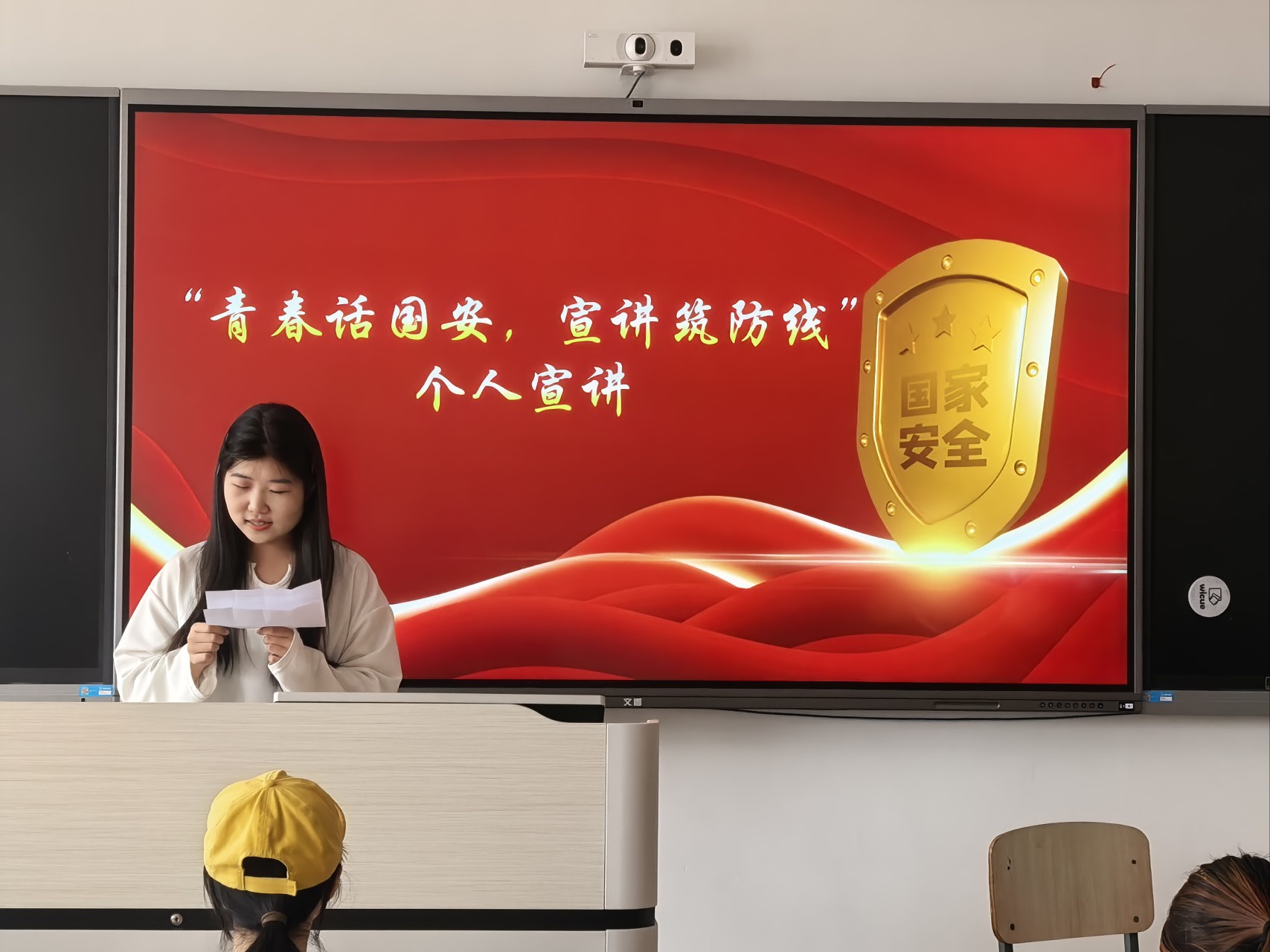 活动伊始,由一名班级同学围绕“国安有我,青年担当”主题进行开篇演讲,系统阐释了总体国家安全观的核心要义、丰富内涵与时代价值,结合当前国家安全形势与青年学生的学习生活实际,深入解读了政治安全、网络安全、文化安全、科技安全等重点领域的安全要求,明确了新时代青年在维护国家安全中的使命与责任。演讲结束后,全体团员集中学习总体国家安全观专题内容,共同观看国家安全主题教育宣传片,通过鲜活案例与权威解读,进一步深化了对国家安全“16个方面”的认知,深刻领悟了“国家安全无小事,人人都是责任人”的核心内涵。随后四位同学依次进行个人宣讲,结合自身学习、生活经历分享学习感悟,围绕“青年如何践行国家安全责任”“如何防范身边的安全风险”等话题分享思考,在思想交流中凝聚了“国安有我、强国有我”的青春共识。